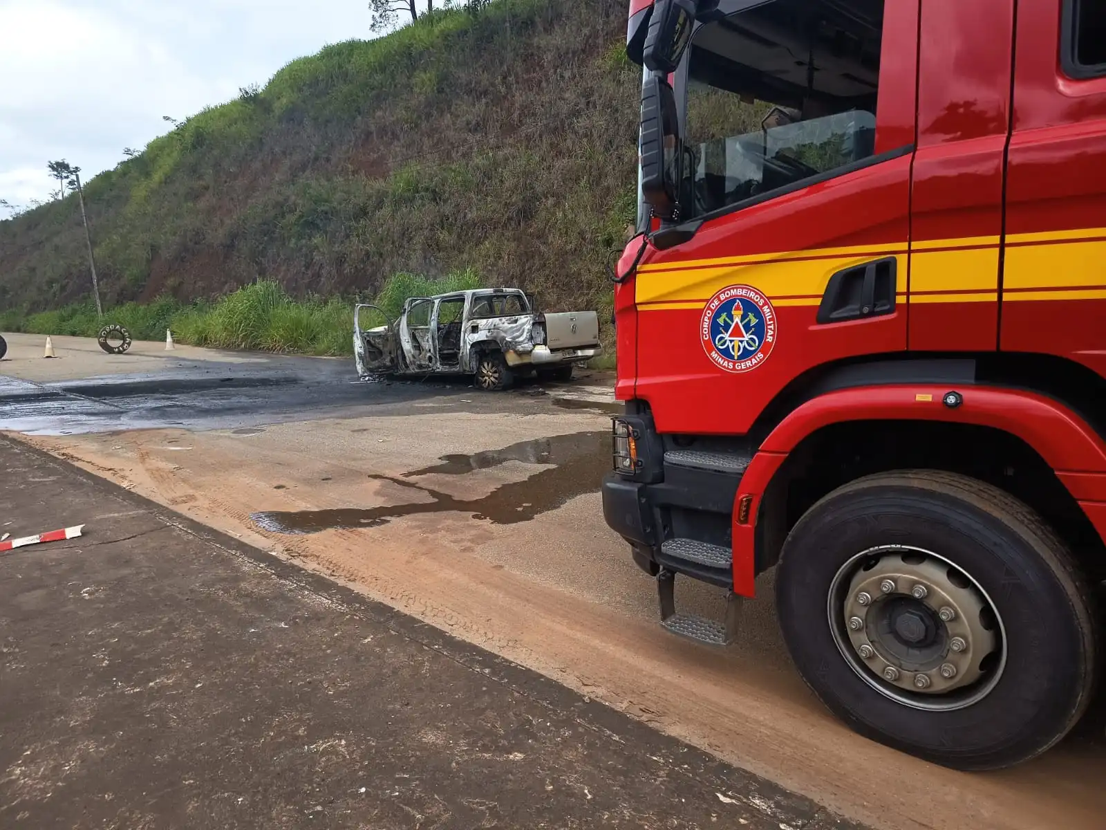 Caminhonete fica completamente destruída após incêndio na MGC-129, em Itabira