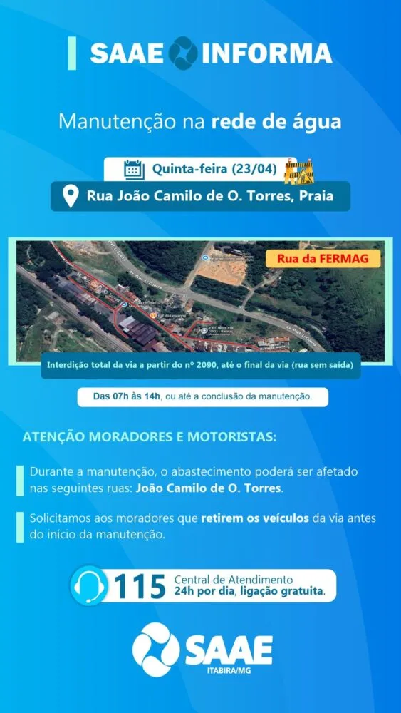 O Serviço Autônomo de Água e Esgoto (Saae) de Itabira realiza, nesta quinta-feira (23), uma manutenção emergencial na rede de água da Rua João Camilo de Oliveira Torres, no bairro Praia.